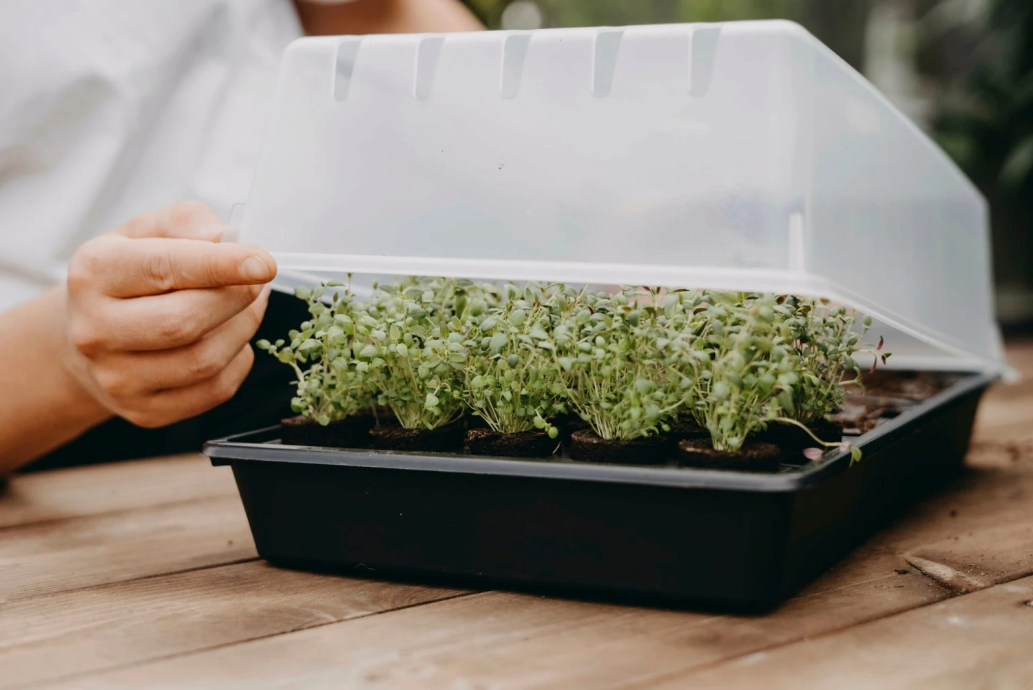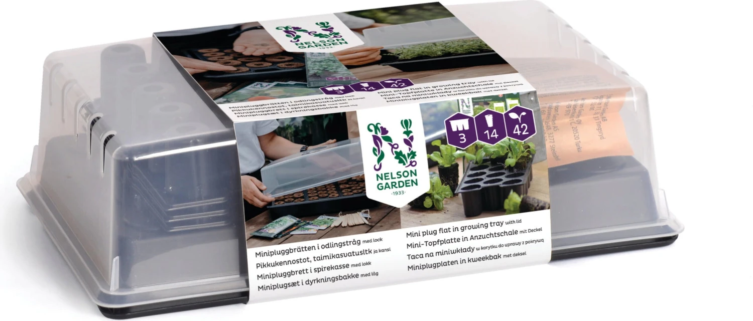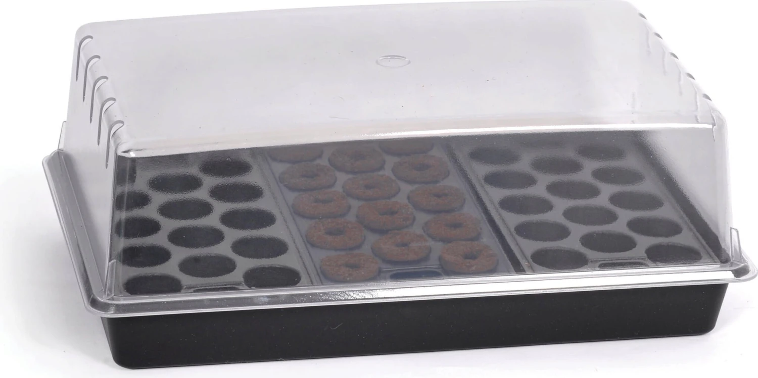 Das Mini-Gewächshaus „Air“ kommt im Set mit einer stabilen Anzuchtschale, einem transparenten Deckel, drei praktischen Mini-Anzuchtplatten sowie 14 Quelltabletten. Es eignet sich hervorragend für die Anzucht und lässt Samen zu stattlichen Pflanzen heranwachsen. Die Mini-Topfplatten erleichtern die Aussaat immens und besitzen je ein Loch an der Unterseite, damit überschüssiges Wasser rasch abfließen kann. Die Verwendung mit Deckel schafft zudem ein optimales Mikroklima, sodass es deinen Pflanzen an nichts fehlt.