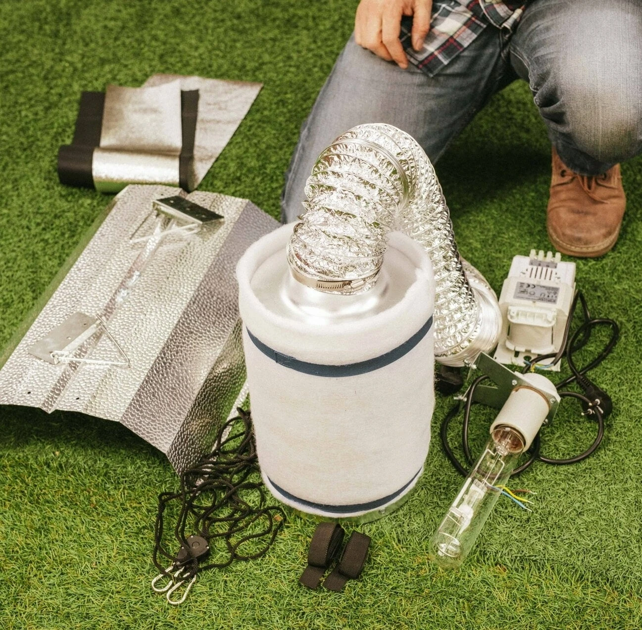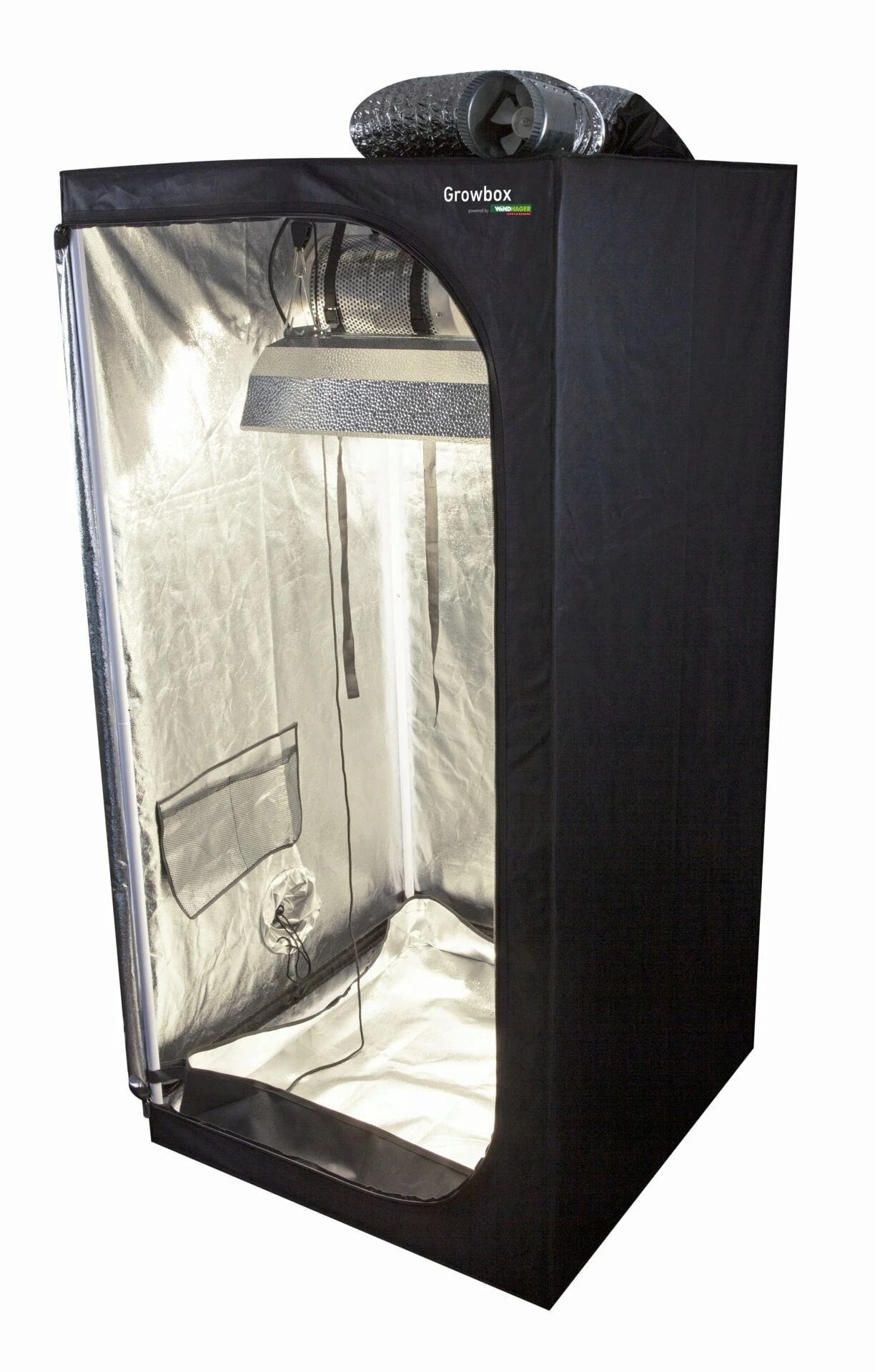 Im Set enthalten: 1 Growzelt, 1 Stucco-Reflektor, Leuchtmittel, Stromversorger, 2 Schlauchschellen, 1 Aktivkohlefilter, 1 Rohrventilator, 1 Alu-Flexrohr, Karabiner, Schnüre, Bedienungsanleitung